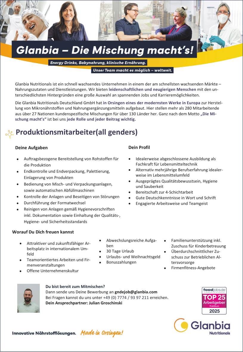 Die Glanbia Nutritionals Deutschland GmbH hat in Orsingen eines der modernsten Werke in Europa zur Herstellung von Mikronährstoffen und Nahrungsergänzungsmitteln aufgebaut. Hier stellen mehr als 280 Mitarbeitende aus über 27 Nationen kundenspezifische Mischungen für über 130 Länder her. Ganz nach dem Motto „Die Mischung macht's" ist bei uns jede Rolle und jeder Beitrag wichtig.